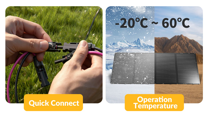 Mango Power solar panels feature Quick Connect for easy use, work stably at -20°C~60°C, have IP67 protection, and are crafted to endure the harshest conditions.