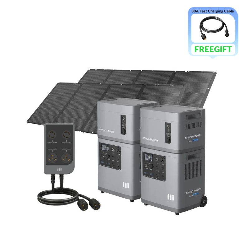 The solar input voltage range for Mango Power E is 60V-150V, with a maximum input power of 2000W. Please connect a minimum of two solar panels in series, and up to three solar panels are supported. Parallel cables are included in the accessories list.