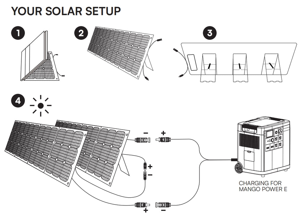 The solar input voltage range for Mango Power E is 60V-150V, with a maximum input power of 2000W. Please connect a minimum of two solar panels in series, and up to three solar panels are supported. Parallel cables are included in the accessories list.