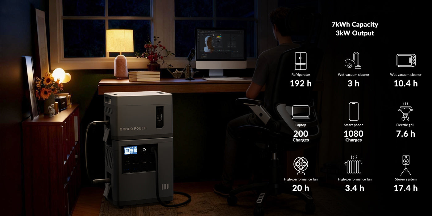 You may expand the device's power capacity to 7066Wh by adding one Mango Power E Battery. With the addition of two bundles (Mango Power E + the Mango Power battery), the capacity will reach up to 14kWh.